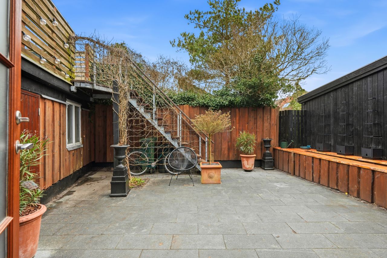 Fra stueplan er der adgang til huset gårdhave samt udhus med sauna – og ovenover denne bygning venter en skøn tagterrasse, hvor solen, roen og havets brusen kan nydes.