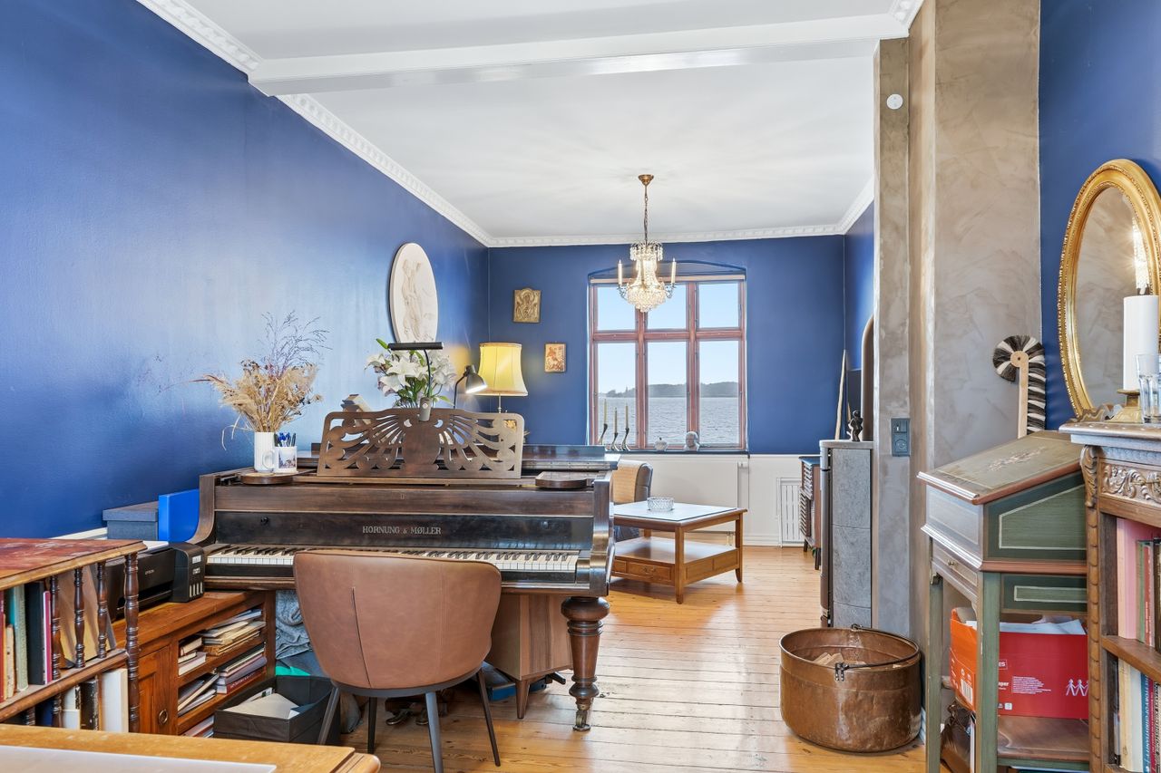 På 1. sal åbner en rummelig trappeopgang op til tagterrassen. Etagen rummer 2 stuer – heraf én med brændeovn (den store stue har tidl. været opdelt i to) Køkken fra 2014/2015. Et oplagt samlingspunkt med plads til både hverdag og gæster. Der er den skønneste havudsigt fra begge stuer.